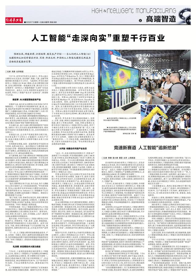 7月7日,在华为开发者大会2023上,华为云盘古大模型3.0正式发布,其在煤矿、铁路、气象、金融等领域展现出来的能力令人咋舌。与此同时,华为在2023世界人工智能大会(WAIC)期间,启动大模型联合创新、发布大模型训推一体化解决方案、推出首个万卡AI集群等一系列在人工智能领域的“大动作”引发业界高度关注。业内人士认为,科技领军企业的发力方向表明,中国人工智能产业正在“走深向实”,将重塑千行百业。